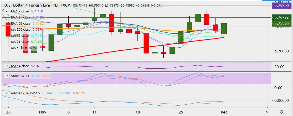 - USD/TRY is currently trading 0.3 percent up at 5.7557, having hit a low of 5.7347 earlier, its lowest since November 25.
