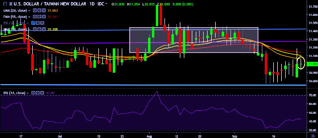 We prefer to take short position on USD/TWD only below 30.87, stop loss at 31.22 and target of 30.54.