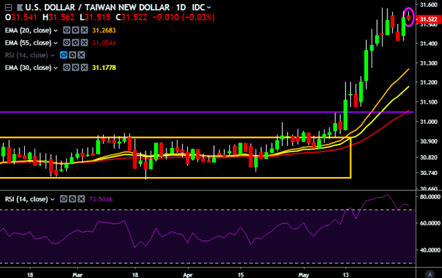 We prefer to take long position on USD/TWD only above 31.57, stop loss at 31.40 and target of 31.90.