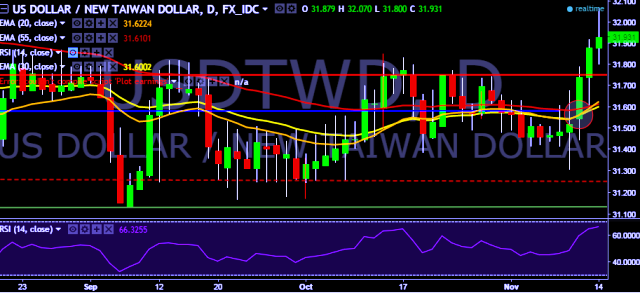 We prefer to go long on USD/TWD around 31.90, stop loss 31.58 and target of 32.18/32.43.