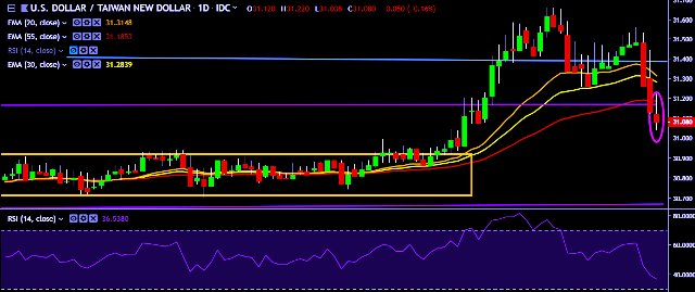We prefer to take short position on USD/TWD around 31.15, stop loss at 31.30 and target of 30.98/30.68.