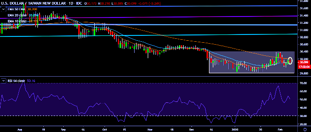 We prefer to take short position on USD/TWD around 30.10, stop loss at 30.27 and target of 30.02/29.87.