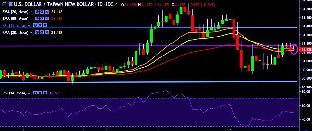 We prefer to take short position on USD/TWD around 31.15 mark, stop loss at 31.25 and target of 31.02/30.89.
