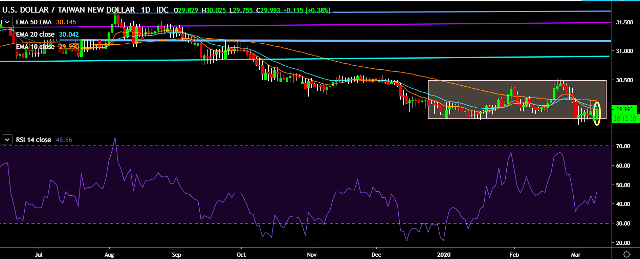 We prefer to take short position on USD/TWD only below 29.74, stop loss at 30.15 and target of 29.46/29.11.