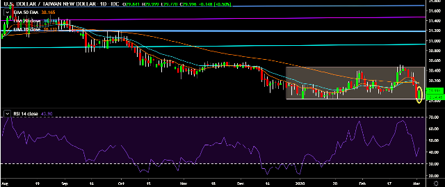 We prefer to take short position on USD/TWD around 30.00, stop loss at 30.10 and target of 29.70/29.46.