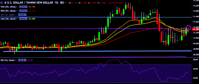 - USD/TWD is currently trading around 31.15 marks.