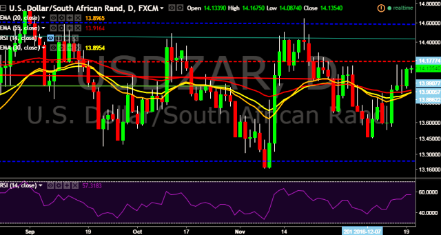 We prefer to go long on USD/ZAR around 14.10, stop loss 13.96 and target of 14.29/14.50.