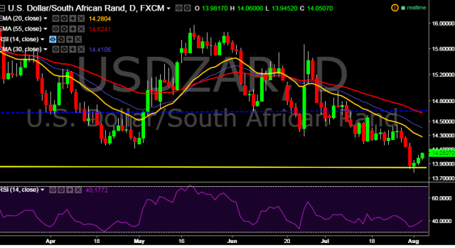 We prefer to take long position in USD/ZAR only above 14.08, stop loss 13.95 and target 14.22/14.48.