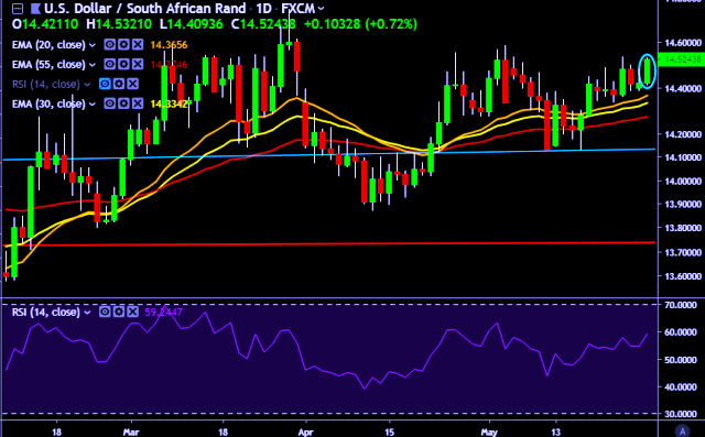 We prefer to take long position on USD/ZAR around 14.48, stop loss at 14.38 and target of 14.75/14.94.