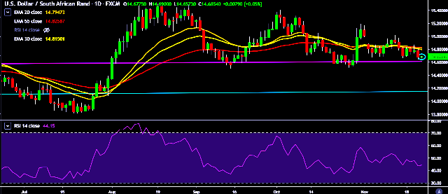 We prefer to take short position on USD/ZAR only below 14.65, stop loss at 14.94 and target of 14.40/14.22.