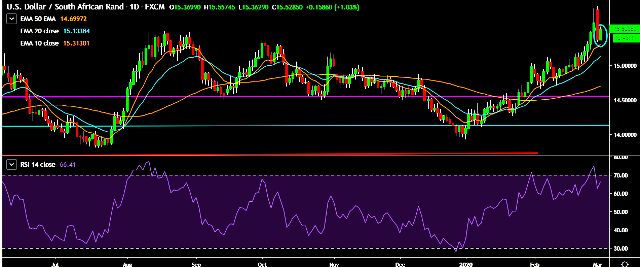 We prefer to take long position on USD/ZAR around 15.50, stop loss at 15.30 and target of 15.70/15.92.