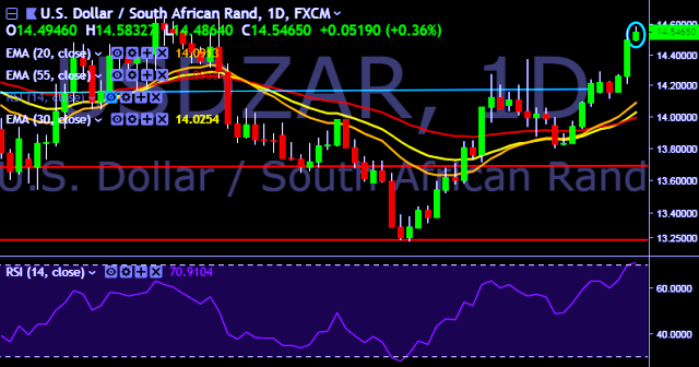 We prefer to take long position on USD/ZAR around 14.50, stop loss at 14.35 and target of 14.94.