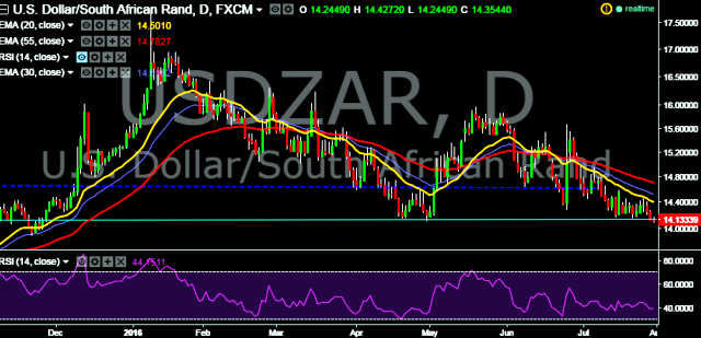 We prefer to take short position in USD/ZAR only below 14.08, stop loss 14.36 and target 13.72/13.26.