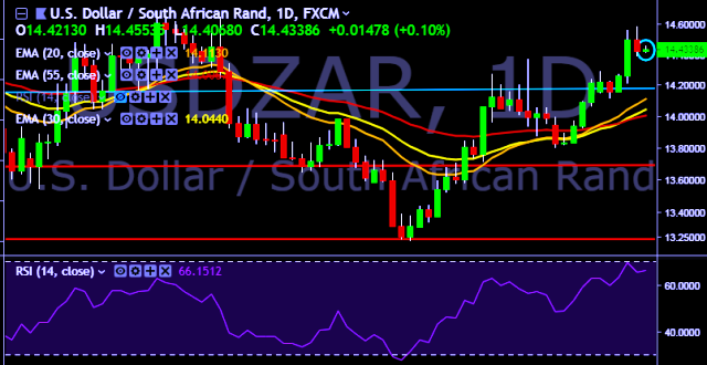 We prefer to take short position on USD/ZAR only below 14.38, stop loss at 14.50 and target of 14.27/14.20.
