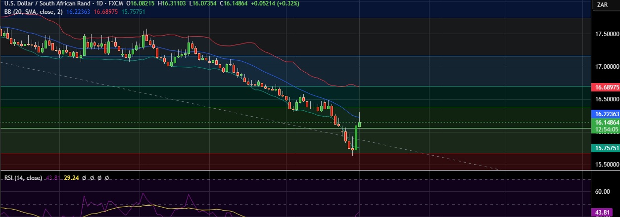 • Strong support is seen at 16.059 (38.2%fib) and break below could take the pair towards 15.756(Lower BB)