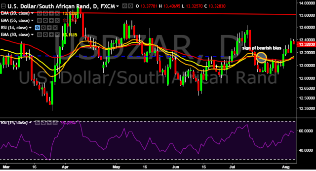 We prefer to take long position on USD/ZAR around 13.28, stop loss at 13.20 and target of 13.55.
