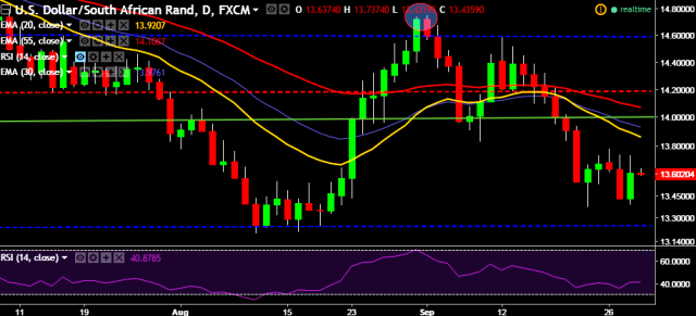 We prefer to go short on USD/ZAR only below 13.54, stop loss at 13.73 and target of 13.37/13.19.