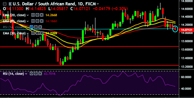 We prefer to take short position on USD/ZAR around 14.10, stop loss at 14.22 and target of 13.93.