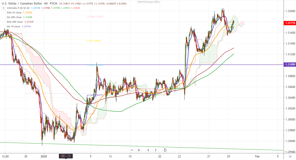 USDCAD has halted its 1-week of the bullish trend and shown a minor decline from the temporary top 1.3205. The pair recovered sharply after dovish BOC and better than expected US economic data. The US Conference Board consumer confidence came at 131.6 in Jan, the highest level in 5 months. The durable goods orders surged 2.4% in Dec vs forecast of 1.2%. The decline in crude oil prices due to the outbreak of coronavirus also putting pressure on the Canadian dollar.