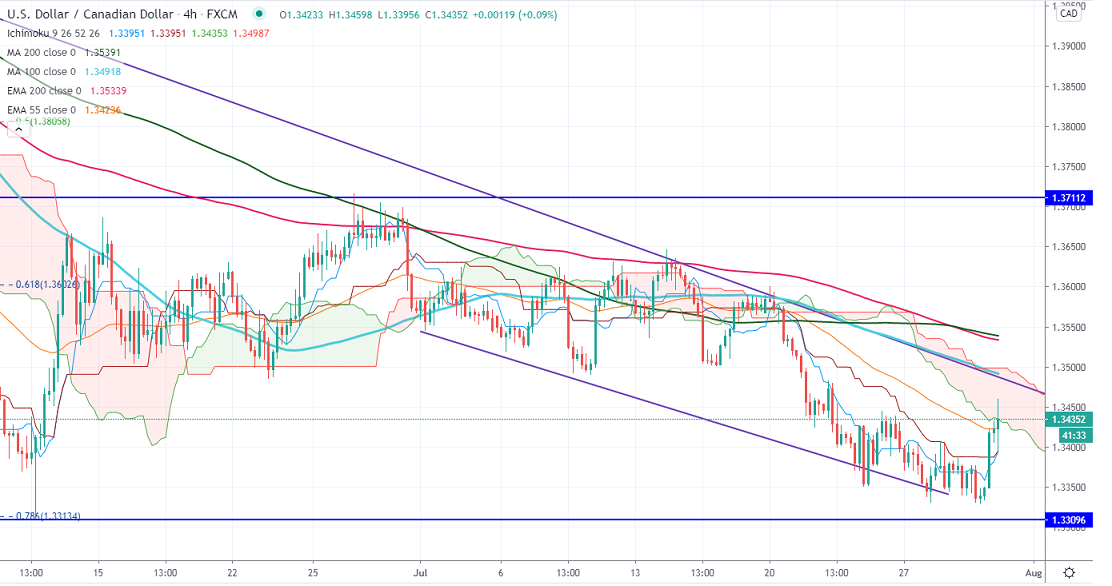 USDCAD recovered more than 100 pips from a low of 1.33317 on weak crude oil prices. The pair was one of the worst performers in the past 1-month and lost more than 350 pips on broad-based US dollar selling. The US GDP declined to -32.9% annualized slightly better than the estimate and continuing claims rose above 17 million. It is currently trading around 1.34412.
