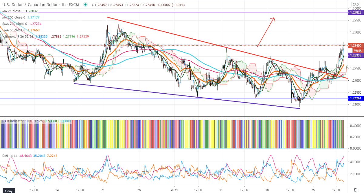 USDCAD has shown a massive jump of more than 200 pips on broad based dollar buying. The huge volatility in the stock market due to risk aversion is putting pressure on the Canadian Dollar at a higher level. The Fed has kept its rates unchanged and said that economic growth will depend on the further spread of the virus and progress of vaccine. DXY's next leg of bullishness will start if it breaks 91 levels. USDCAD hits an intraday high of 1.28609 and currently trading around 1.28393.