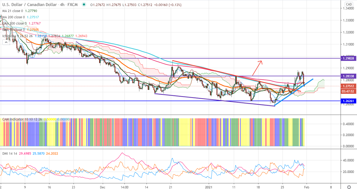 USDCAD has declined more than 100 pips from a high of 1.2870 on strong Canada GDP. The Canadian economy came at 0.7% in November compared to a forecast of 0.4%. The economy is in expansion mode for the past seven months. DXY's next leg of bullishness will start if it breaks 91 levels. USDCAD hits an intraday high of 1.28609 and currently trading around 1.28393.