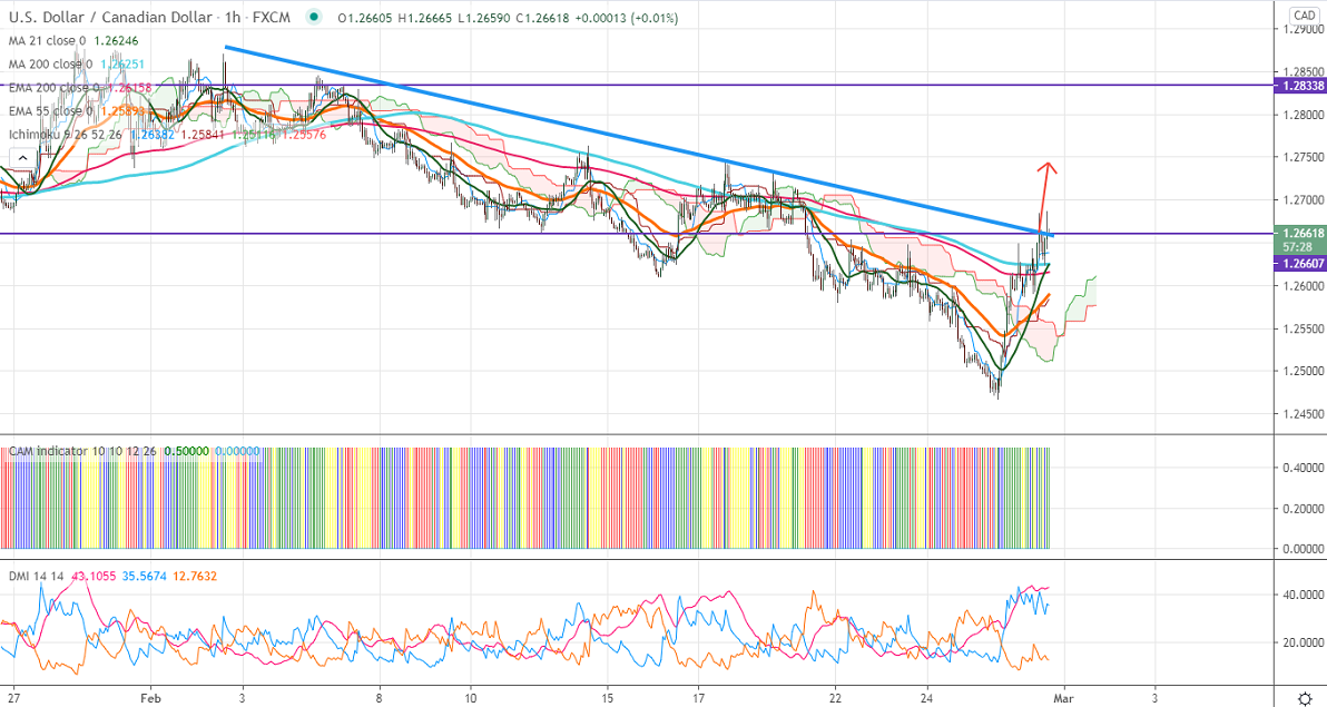 USDCAD jumped more than 200 pips on broad-based US dollar buying. The surge in US 10- year yield on hopes of more fiscal stimulus in the US is supporting the dollar at lower levels. Personal income in the US soared to 10% in Jan slightly better than the forecast of 9.5%. US Chicago PMI declined to 59.5 in Feb slightly less than the estimated 61.1. USDCAD hits an intraday high of 1.26861 and currently trading around 1.26586.
