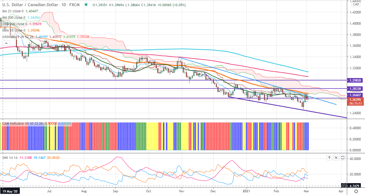USDCAD has taken support near trend line support and jumped more than 250 pips on broad-based US dollar buying. The upbeat market sentiment and surge in crude oil prices are supporting the Canadian dollar. The Canadian GDP came at a 9.6% annualized rate in the fourth quarter compared to a forecast of 7.43%. USDCAD hits an intraday high of 1.26982 and currently trading around 1.26466.