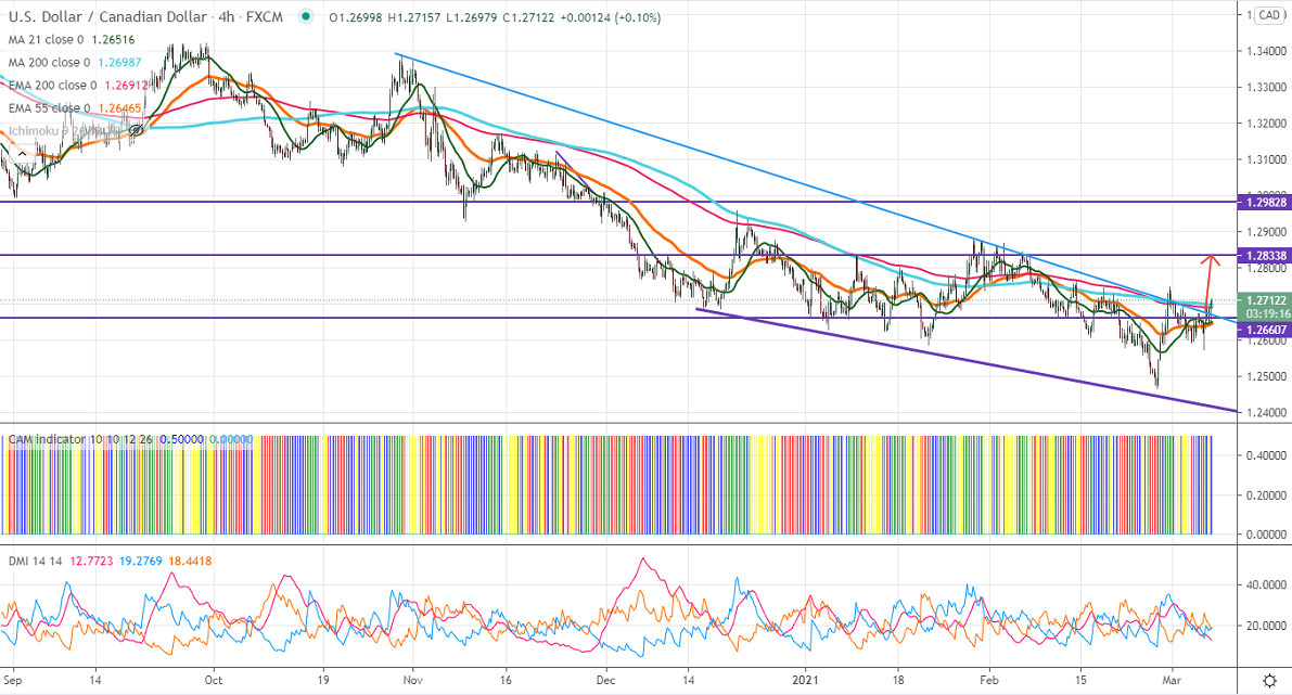 USDCAD recovered more than 100 pips from a low of 1.25755 on broad-based US dollar buying. The surge in US bond yield is supporting the US dollar at lower levels. DXY is holding well above 91.650, a jump till 92.85 likely. The number of people who have filed for unemployment benefits rose to 745000 for the week ended Feb 27th compared to a forecast of 758K. Markets eye US Non-Farm payroll data for further direction. USDCAD hits an intraday high of 1.27077 and currently trading around 1.26986.