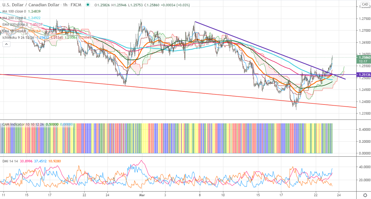 USDCAD continues to trade higher and broken significant resistance 1.2550 on broad-based US dollar buying. The major sell-off in Crude oil prices is also putting pressure on the Canadian dollar. The extension of lockdown in Germany till Apr 18 and slow vaccine rollout in European countries has increased demand for safe-haven assets like yen, US dollar. The US 10-year bond yield cooled off after hitting a fresh multi-year high. DXY is consolidating in a narrow range between 91.30 and 92.16 in the past three days.