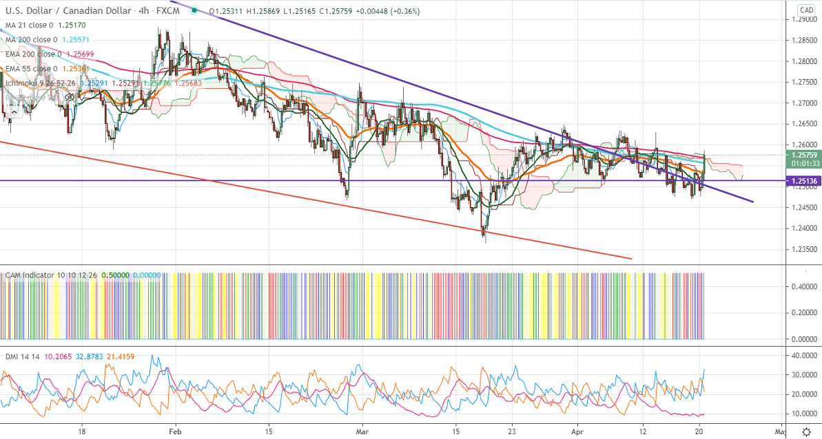 USDCAD is consolidating in a narrow range between 1.2470 and 1.25594 for the past four days. The broad-based US dollar selling is putting pressure on this pair at higher levels. The surge in the number of coronavirus in Canada after the Easter holidays is preventing USDCAD from further selling. Markets eye Bank of Canada monetary policy meeting tomorrow for further direction. The US dollar index is trading weak for third consecutive days and trading well below 200- day MA. USDCAD hits an intraday high of 1.2540 and is currently trading around 1.25226.