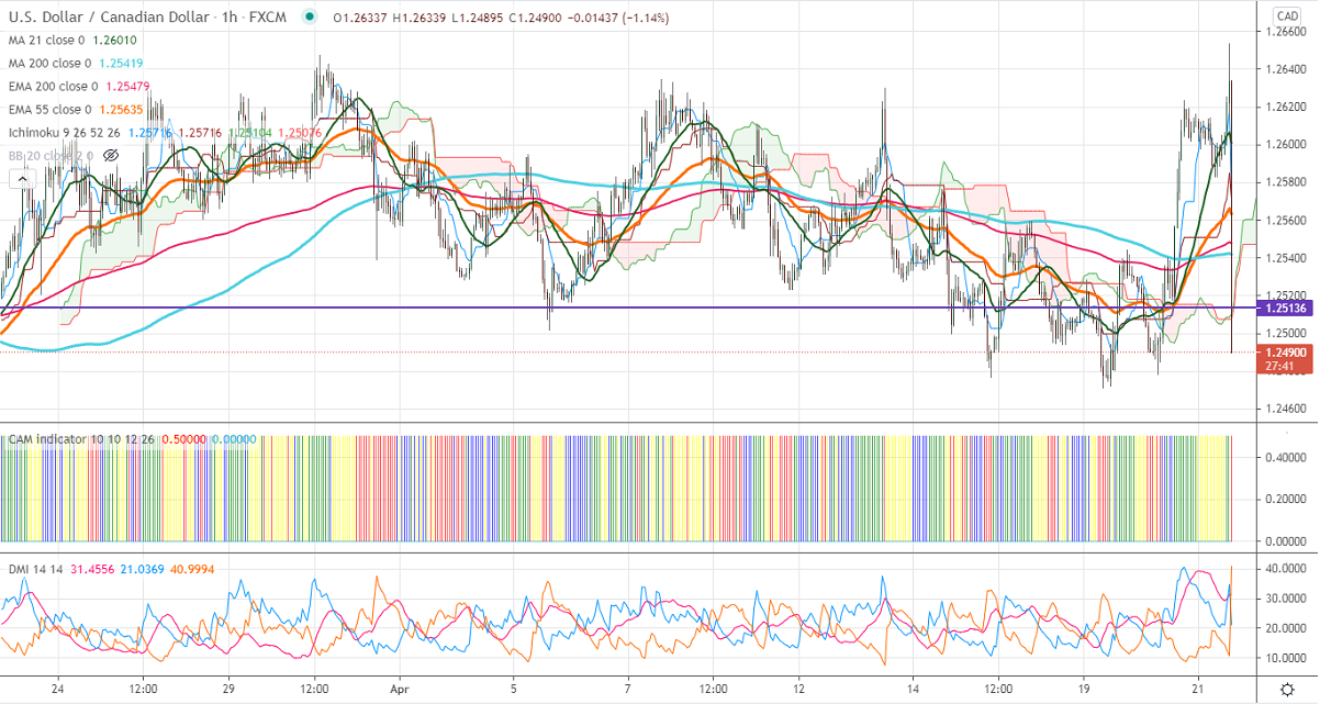 USDCAD continues to trade lower after the Bank of Canada monetary policy. The central has kept its interest rates unchanged at 0.25% and tapers bond-buying by $1B/week to $3B/ week. It has upgraded its economic outlook to 6.5% in 2021 from January forecasts of 4.0%. The rates are also expected to rise much sooner than the previous forecast of 2023. The US dollar index is holding above 91 levels. The significant buying can happen only if it breaks 91.70.USDCAD hits an intraday low of 1.24905 and is currently trading around 1.25015.