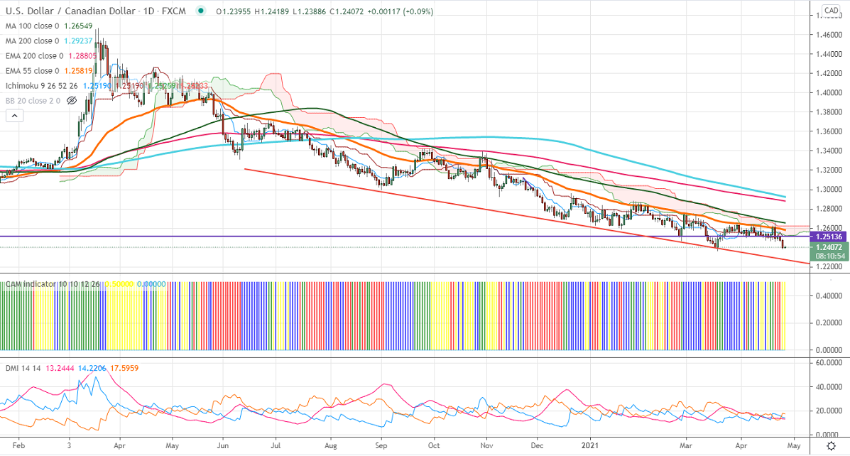 USDCAD continues to trade lower and settled below the 1.24000 level on broad-based US dollar selling. The overall bullish trend in the commodity market especially in copper which hits highest since 2011.it is pushing the commodity currencies like Canadian and Australian dollar. The US dollar index is struggling to close above 91 levels. Any break above 91.25 confirms intraday bullishness. Markets eye BOC Governor Macklem's speech for further direction. USDCAD hits an intraday low of 1.23886 and is currently trading around 1.24806.