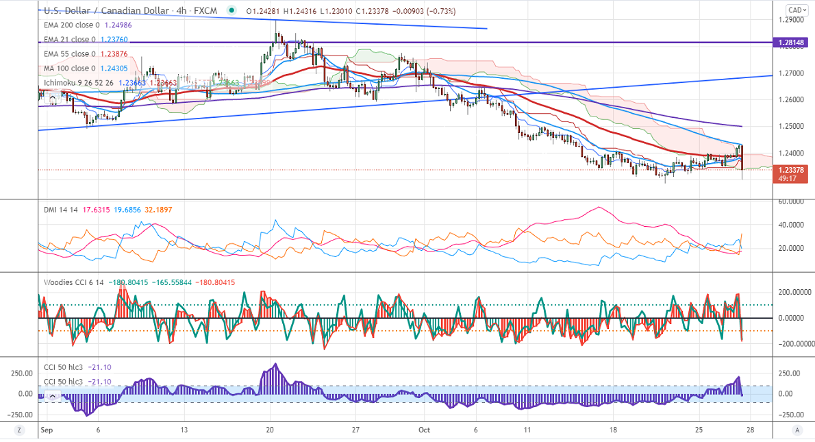The pair declined sharply after the hawkish Bank of Canada monetary policy. The central bank has kept its rates unchanged and ended its quantitative easing. It has moved up its timeline to the "middle quarters of 2022". It hits an intraday low of 1.23010 and is currently trading around 1.23381. The short-term trend remains bearish as long as resistance 1.2500 holds.
