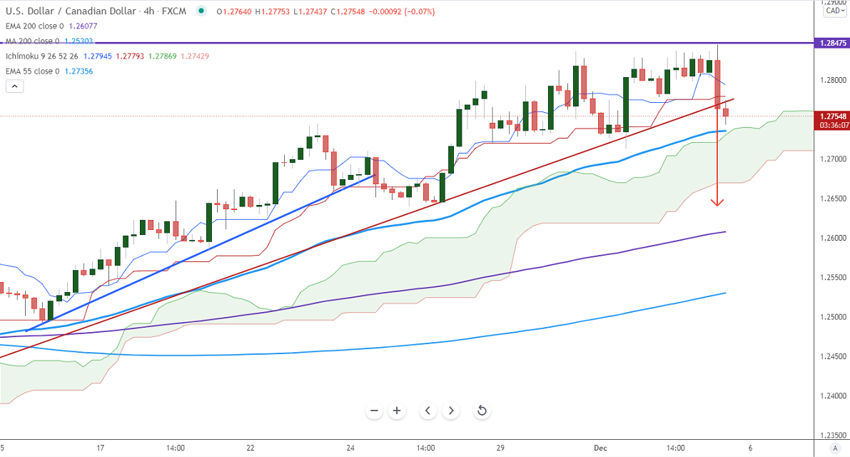 The pair lost more than 50 pips after upbeat Canadian jobs data. The employment change came at 153.7K better than the forecast of 36.5K, unemployment dropped to 6% compared to 6.7% in October. The U.S jobs data miss market estimate. The economy has added 210000 jobs in Nov compared to an estimate of 550000. The unemployment rate came at 4.2% from 4.6% the previous month.US dollar index is recovered from a low of 95.96. Any breach above 96.65 confirms intraday bullishness. USDCAD hits an intraday low of 1.27553 and is currently trading around 1.27556. The intraday trend remains bearish as long as resistance 1.2850 holds.