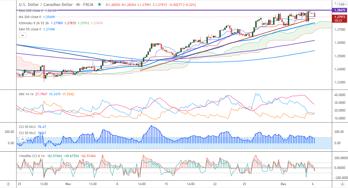 The pair recovered sharply despite weak US jobs data. The economy has added 210000 jobs in Nov compared to an estimate of 550000. The unemployment rate came at 4.2% from 4.6% the previous month. The Canadian employment change came at 153.7K better than the forecast of 36.5K, unemployment dropped to 6% compared to 6.7% in October. The overall weakness in crude oil price due to the spread of the Omicron virus is also putting pressure on the Canadian dollar at higher levels. USDCAD hits an intraday low of 1.27951 and is currently trading around 1.27956. The intraday trend remains bullish as long as support 1.2740 holds.