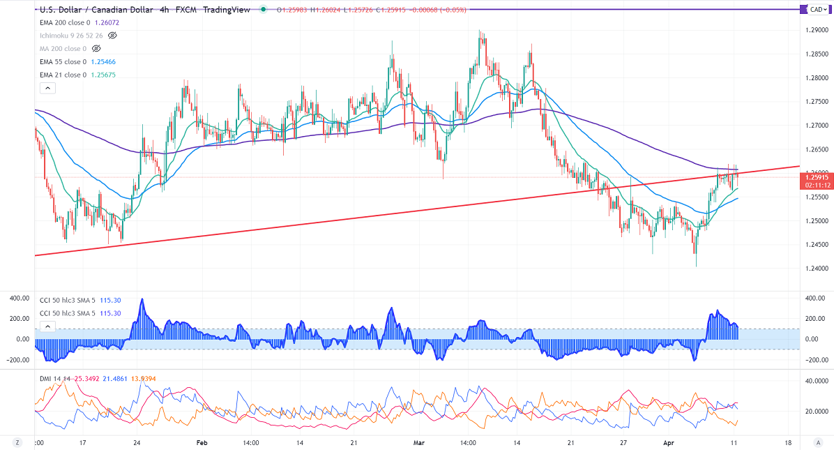 USDCAD is holding above short-term (21 EMA), medium-term (55 EMA), and below long-term ( 200 EMA) in the 4-hour chart.