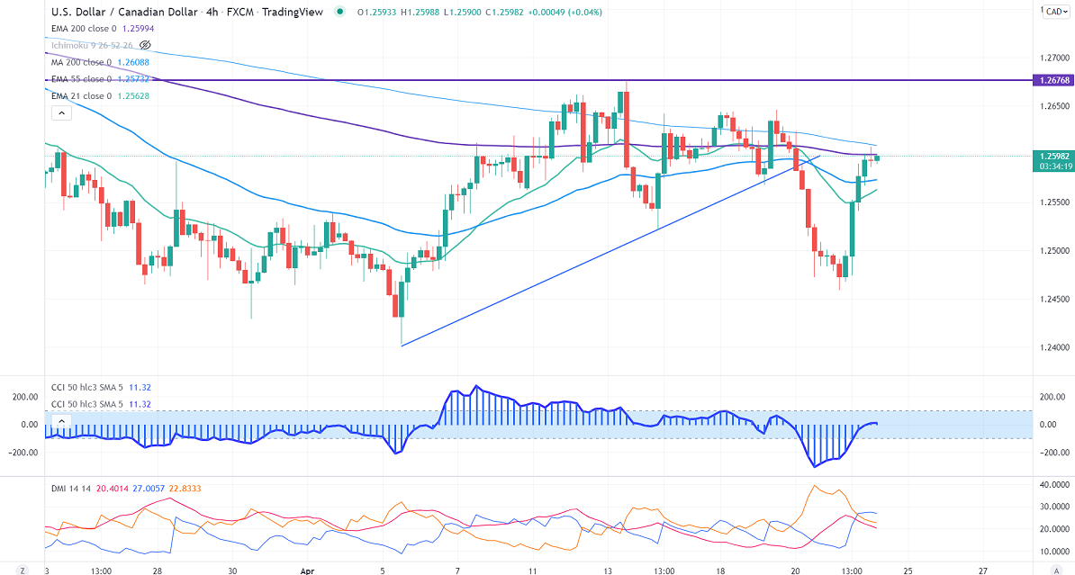 USDCAD is holding above short-term (21 EMA), medium-term (55 EMA), and below long-term ( 200 MA) 1.26110 in the 4-hour chart.