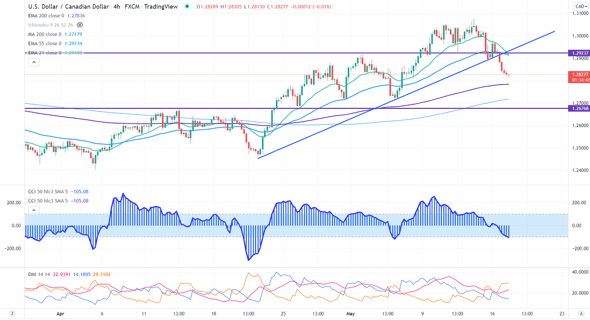 USDCAD is holding below short-term (21 EMA), medium-term (55 EMA), and above long-term ( 200 MA) 1.27835 in the 4-hour chart.