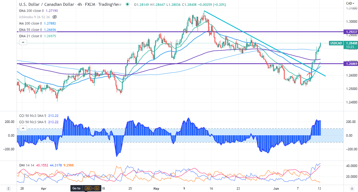 USDCAD gained more than 300 pips in the past four days on board-based US dollar buying. US CPI came at 8.6% in May compared to a forecast of 8.3%, the largest YOY increase in 40 years. Surging Inflation has increased the chance of aggressive rate hike. Technically in the 4-hour chart, the pair is holding above the short-term (21- and 55 EMA) and long-term moving average of 200 MA (1.2788). Any close below that level of 1.2780 confirms a bearish trend. A dip to 1.2730/1.2680 is possible. USDCAD hits an intraday low of 1.28366 and is currently trading around 1.28444.
