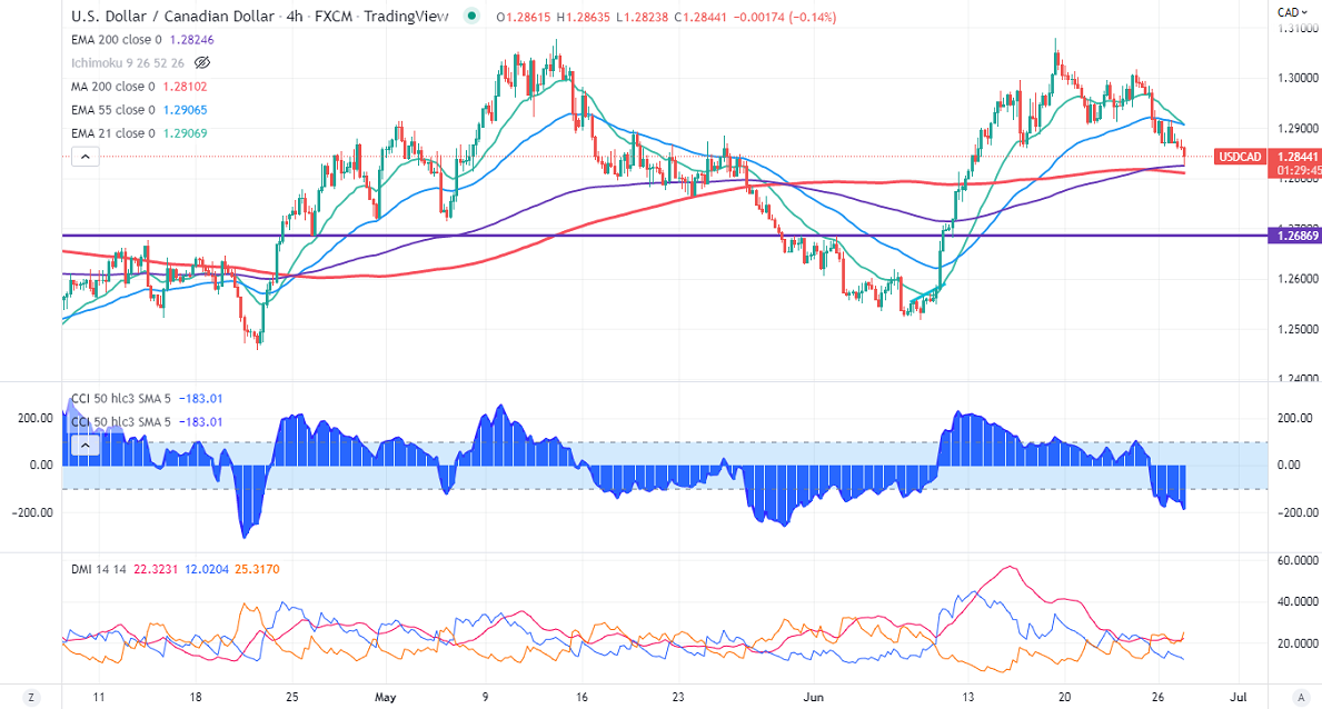 USDCAD trades weak for a third consecutive day on board-based US dollar weakness. The weak economic data and high inflation could prevent aggressive rate hikes by Fed. Higher oil prices boost the Canadian dollar higher. Technically in the 4- hour chart, the pair is holding below the short-term (21- and 55 EMA) and above the long-term moving average of 200 EMA (1.282414). Any break below 1.2800 confirms a bearish continuation. A dip to 1.2778/1.2700 is possible. USDCAD hits an intraday low of 1.28238 and is currently trading around 1.28432.