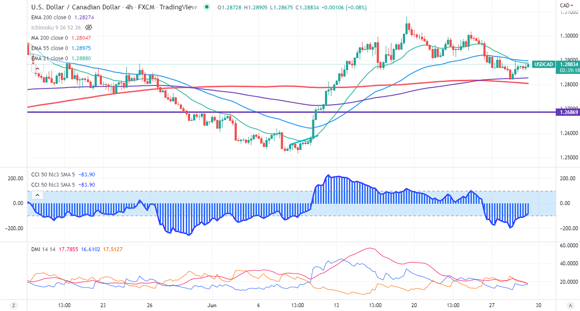 USDCAD gained more than 70 pips from a temporary bottom of 1.28190 on board-based US dollar buying. It recovered above 104.50 despite weak US economic data. US Conference Board consumer confidence came drops to 98.7 in June vs . Forecast of 100. Richmond manufacturing index came at -19 for June vs –9 prior. Market eyes US Fed chairman Powell's speech for further direction. The rebound in oil prices prevents the pair from further upside. Technically in the 4- hour chart, the pair is holding below the short-term (21- and 55 EMA) and above the long-term moving average of 200 EMA (1.28268). Any close below 1.2820 confirms a bearish continuation. A dip to 1.2778/1.2700 is possible. USDCAD hits an intraday high of 1.28905 and is currently trading around 1.28847.
