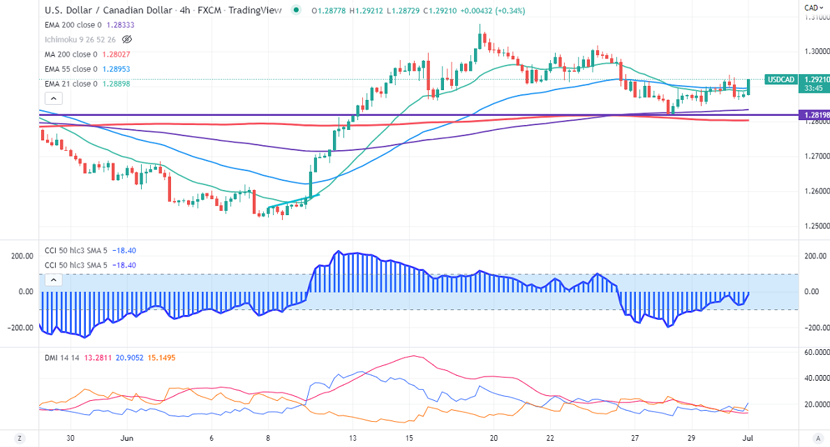 USDCAD regained above 1.29000 after Canadian GPD data. It grew 0.3% in Apr, while an early estimate for May shows a decline of 0.2%. US dollar index pared some of its gains after downbeat personal spending and weak PCE. Markets eye the US ISM manufacturing index for further direction. The minor sell-off in oil prices also pushes the pair further higher. Technically in the 4 -Hour chart, the pair is holding above the short-term (55 EMA, and 21- EMA), and the long-term moving average of 200 EMA (1.28324). Any violation above 1.2860 confirms a bearish continuation. A dip to 1.2820/1.2778/1.2700 is possible. USDCAD hits an intraday high of 1.29199 and is currently trading around 1.29166.