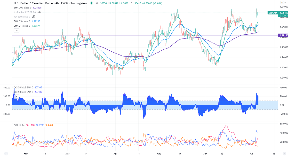 USDCAD regained above 1.3000 on board-based US dollar buying. The massive sell-off in crude oil prices also puts pressure on the Canadian dollar.US dollar index breaks significant resistance at 105.78 and hits a 19-year high on recession fears. Technically in the 4 -Hour chart, the pair is holding below the short-term (55 EMA, and 21- EMA), above the long-term moving average of 200 EMA (1.28491). Any violation below 1.300 confirms the intraday bearish trend. A dip to 1.2940/1.29150 is possible. USDCAD hits an intraday high of 1.3055 and is currently trading around 1.30514.