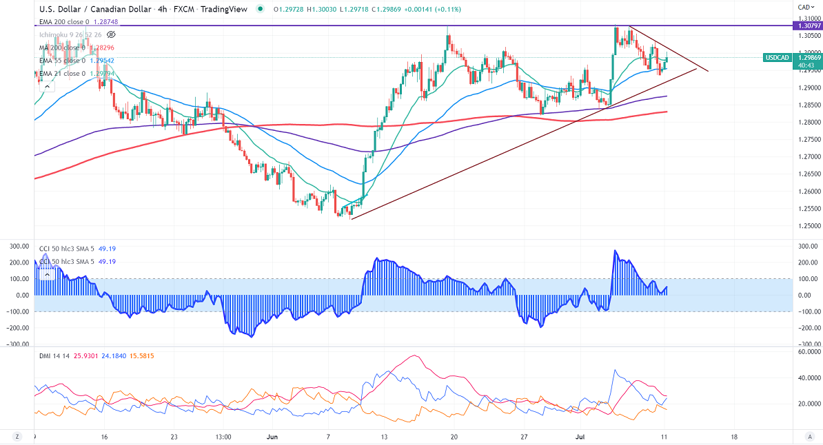 USDCAD regained above 1.3000 on board-based US dollar buying and weak Canadian employment data. The Canadian economy lost 42000 jobs in June compared to a forecast of 20000 and the unemployment rate dropped from 4.9% to 5.1%. The US dollar index regained momentum after a minor sell-off from a 19-year high. Technically in the 4 -Hour chart, the pair is holding below the short-term( 21- EMA), above 55- EMA, and the long-term moving average of 200 EMA (1.28736). Any violation below 1.2920 confirms the intraday bearish trend. A dip to 1.2865/1.2800 is possible. USDCAD hits an intraday high of 1.30030 and is currently trading around 1.29835.