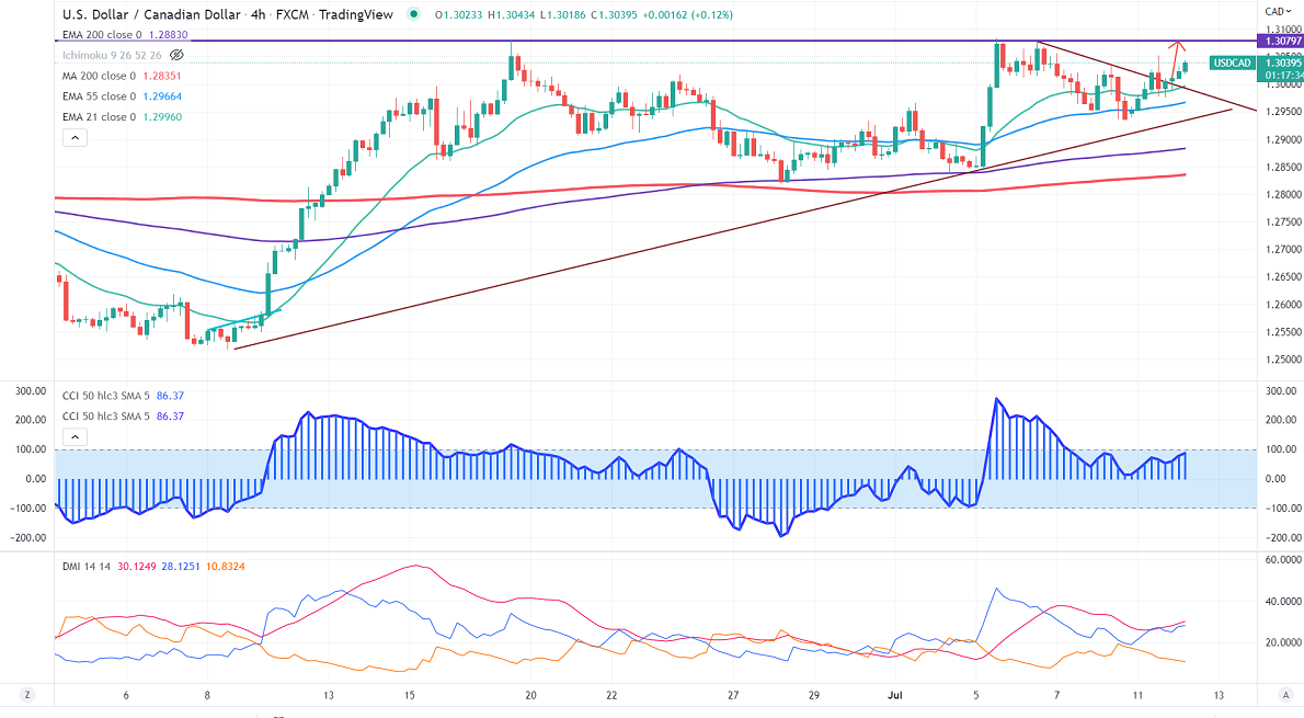 USDCAD has broken trend line resistance and holds well above that level. The recession risks and surge in inflation support the US dollar at lower levels. US dollar index continues to gain and hits the highest level since Oct 2002. Any surge above 107.78 confirms a bullish continuation, a jump to 109/110 is possible. Technically in the 4 -Hour chart, the pair is holding below the short-term( 21- EMA), above 55- EMA, and the long-term moving average of 200 EMA (1.28814). Any violation below 1.300 confirms the intraday bearish trend. A dip to 1.2960/1.2920 is possible. USDCAD hits an intraday high of 1.30396 and is currently trading around 1.30369.