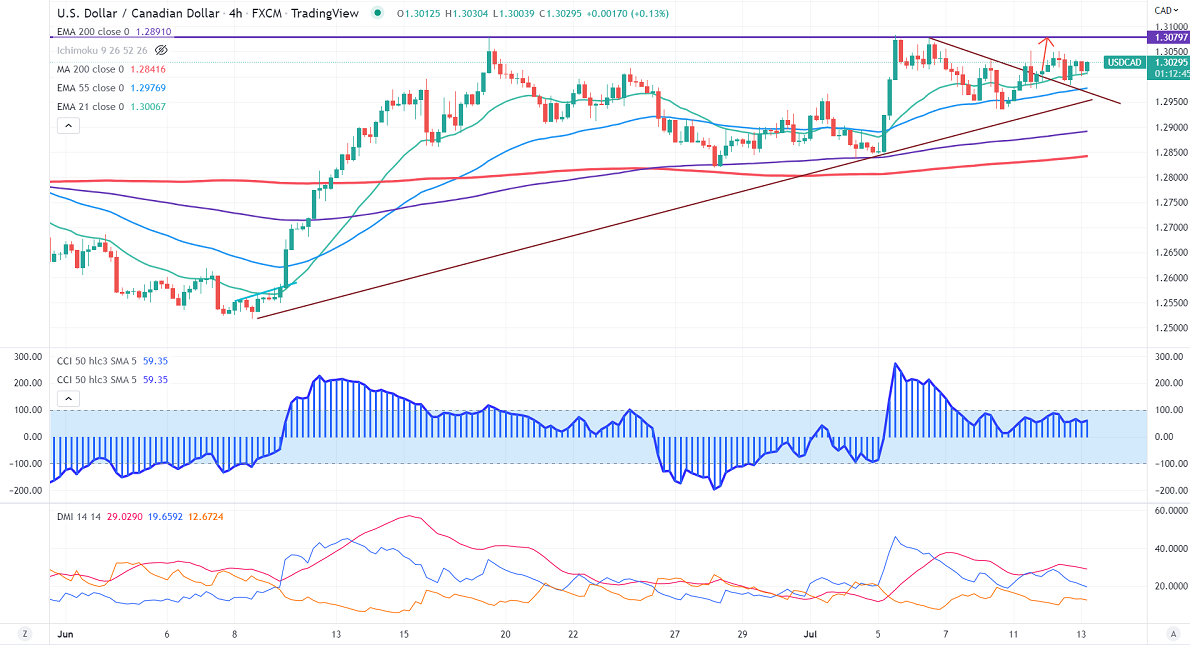 USDCAD trades flat after forming a minor top around 1.30834. Markets eye US CPI data and BOC monetary policy today for further direction. The recession risks and policy divergence between US Fed and BOC support the US dollar at lower levels. US dollar index pared some of its gains on profit booking. Any surge above 108.56 confirms further bullishness. Technically in the 4 -Hour chart, the pair is holding above the short-term( 21- EMA), 55- EMA, and the long-term moving average of 200 EMA (1.28814). Any violation below 1.2980 confirms the intraday bearish trend. A dip to 1.2960/1.2920 is possible. USDCAD hits an intraday high of 1.30304 and is currently trading around 1.30262.