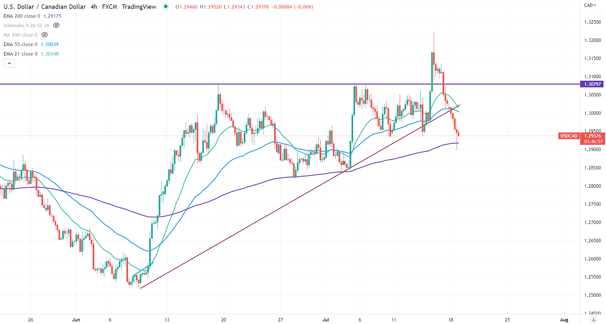USDCAD pared most of its gains on board-based US dollar weakness in the previous week. The bank of Canada surprised markets by hiking 100 bpbs in Jul 13th monetary policy.US retail sales rose by 1% m/min June compared to a forecast of 0.70%. Technically in the 4 -Hour chart, the pair is holding below the short-term( 21- EMA), 55- EMA, and above the long-term moving average of 200 EMA (1.29159). Any violation below 1.2900 confirms the intraday bearish trend. A dip to 1.2830/1.2800 is possible. USDCAD hits a low of 1.28965 and is currently trading around 1.29371.