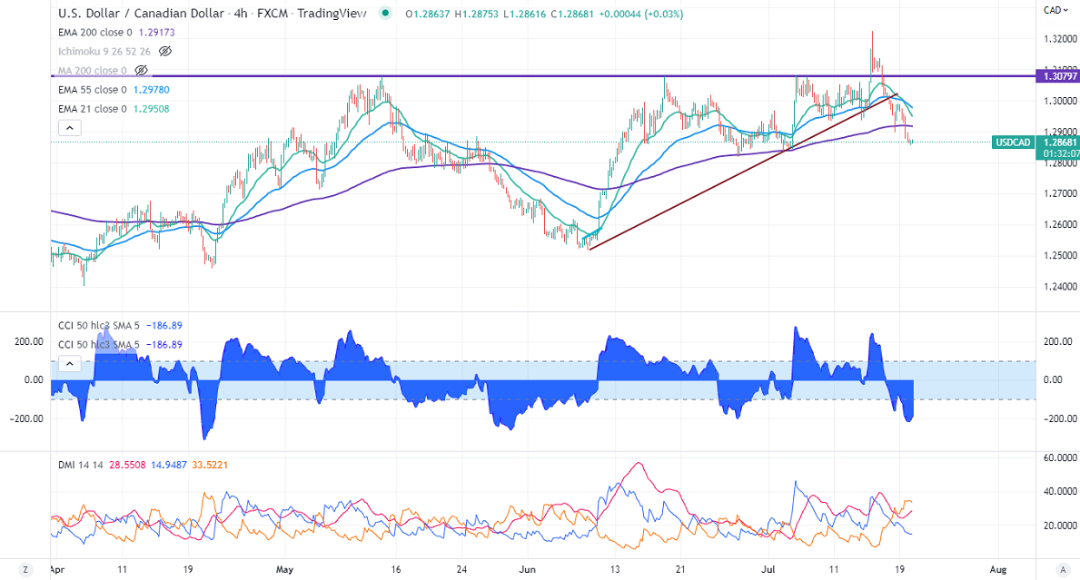 USDCAD is trading weak for the fourth consecutive day on board-based US dollar selling. The Canadian dollar performed well against all majors after a surprise 100 bpbs hawkish rate hike by the Bank of Canada. Technically in the 4 -Hour chart, the pair is holding below the short-term ( 21- EMA), 55- EMA, and above the long-term moving average of 200 EMA (1.29178). Any close below 1.2850 confirms the intraday bearish trend. A dip to 1.2800/1.2740 is possible. USDCAD hits a low of 1.28554 and is currently trading around 1.28650.