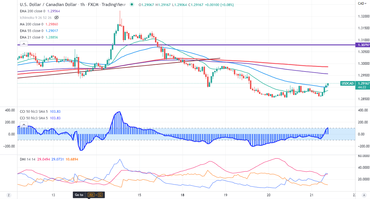 USDCAD gained above 1.2900 on weak Canadian CPI data. The yearly inflation surged from 7.7% to 8.1% in June, below expectations of 8.8%. It has lost more than 50 pips after the data. Technically in the 1 -Hour chart, the pair is holding above the short-term ( 21- EMA), 55- EMA, and below the long-term moving average of 200 EMA (1.29573). Any close above 1.2920 confirms the intraday bullish trend. A jump to 1.2960/1.300 is possible. USDCAD hits a high of 1.29158 at the time of writing and is currently trading around 1.29133.